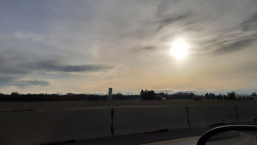 Note the rainbow aura of the sun, center of photo. The clouds around and the sun look like an eye assessing the landscape and prism. The rearview mirror to lower right allows a glimpse of what the eye sees behind us, further.