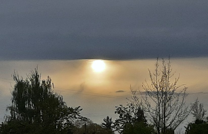 The colored shapes above the sun look like a Brontosaurus on the right looking to our right over its left shoulder and its child or a smaller dinosaur also looking to our right, but its head and neck are hidden behind the foreground tree. What do they hear and see?