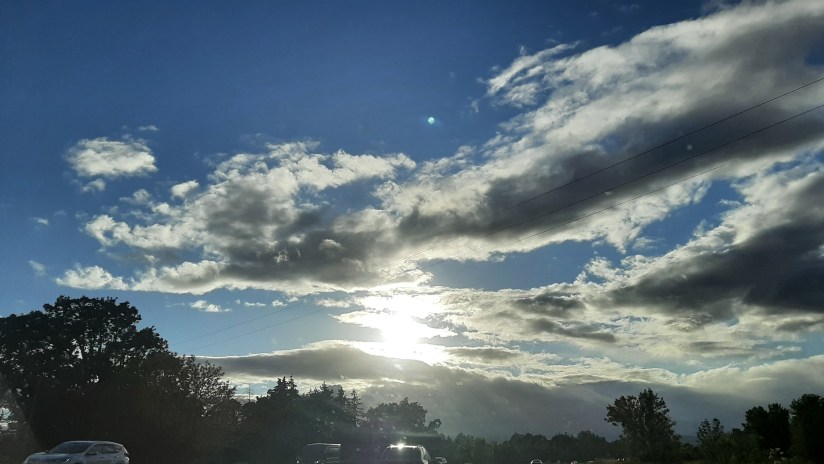 See the darling top clouds playing? They have long, puffy tails like squirrels. A little one on top upper right and a larger one below it to left, looking over its shoulder at the first as they frolick and gambol.