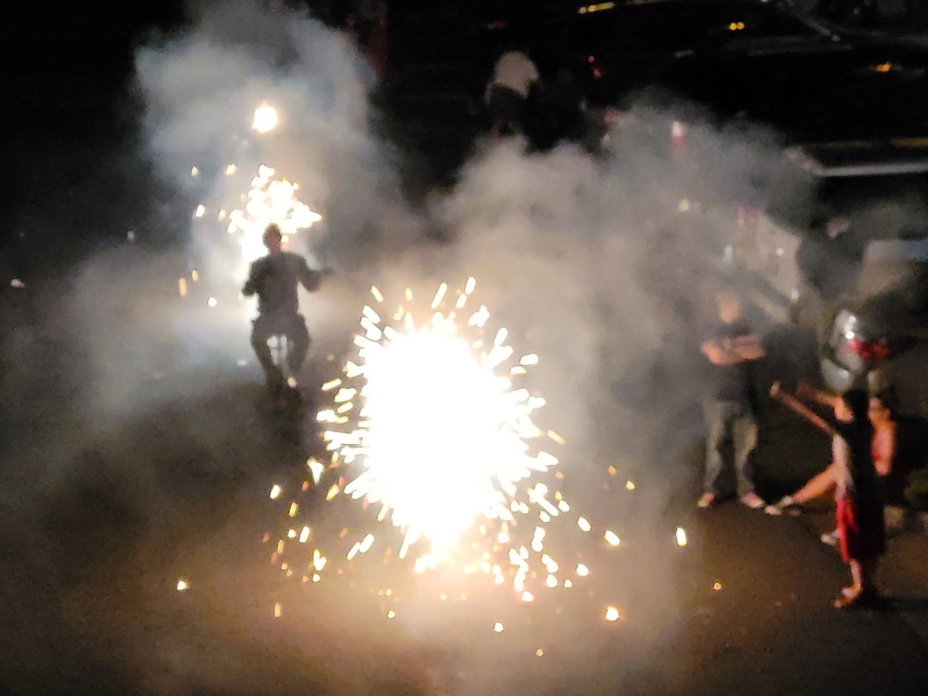 Having wound their way carefully, yet with haste, they found a spot along the bridge’s sidewalk railway with the rest of the crowding onlookers to view the fireworks clearly displayed overhead.