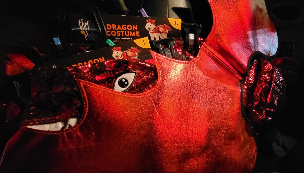 Upon exchanging a too large lamp for a smaller night heating lamp for our small lizard-type family member, I saw on display for our Halloween pups a RED DRAGON COSTUME!!!