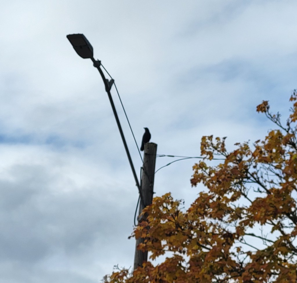 It was flying around from tree to post, from the right and then front across the street from the dogs and me, cawing sharp and loudly to the world about something.