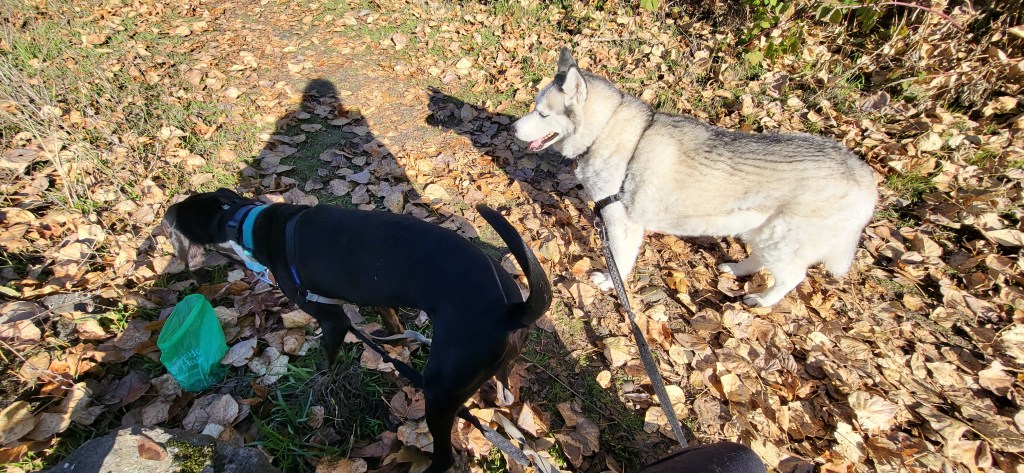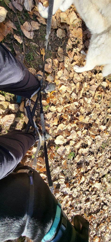 In order to eat my oatmeal in peace, I tied the dog leash around my ankle. The wolf realized she could tug and make it longer, while the hound got tugged closer to my side and whined about it!