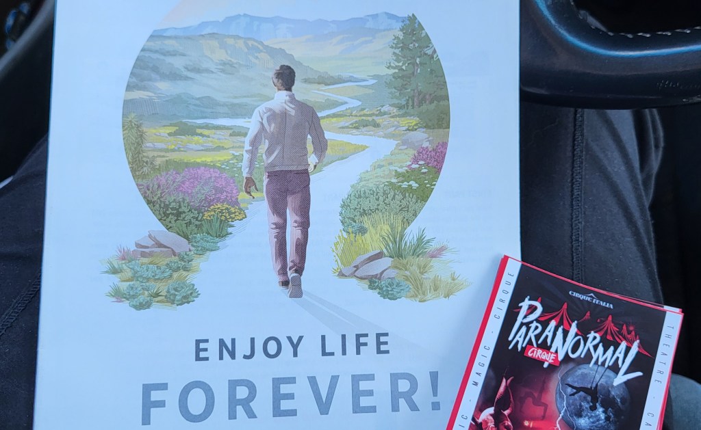 Stopping outside the Starbucks, in front of me and to the right about 5 feet on the shaded sidewalk next to the busy street, two men with their backs to me were advertising JW. Then I went into the shop and came back out to find these tickets under my windshield wiper focusing on El Diableo and the paranormal. The placer had passed behind them advertising symbolic counterpoint to Jehovah’s Witness messaging! And when I parked outside my bank, these songs were playing next door at a restaurant’s outdoor patio dining: The Laat In Line by Dio; Heaven’s On Fire By Kiss; I Wanna Rock by Twisted Sister; Long Live Rock ‘N Roll by Rainbow; and Creatures Of Night by Kiss. Classic.