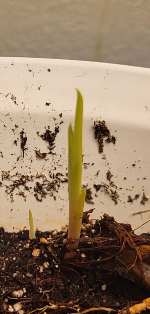 A purple iris root mass finally sprouting!